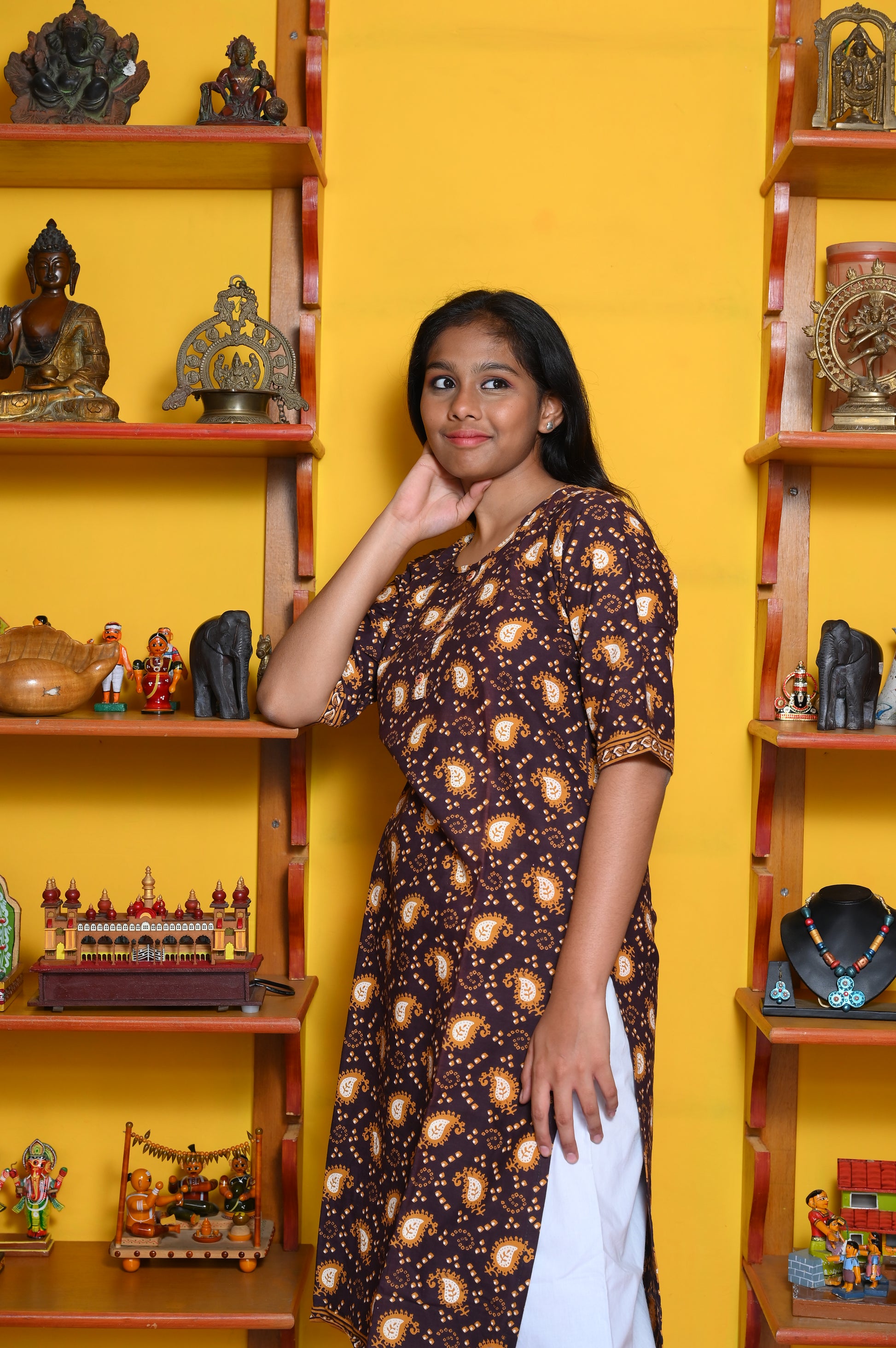 This brown cotton kurta features elegant cream prints, blending traditional design with breathable fabric for all-day comfort. Its natural cotton composition ensures softness and durability, making it ideal for both casual and semi-formal occasions. The understated print adds refined detail without overwhelming the garment, suitable for those who appreciate timeless style paired with functional wear