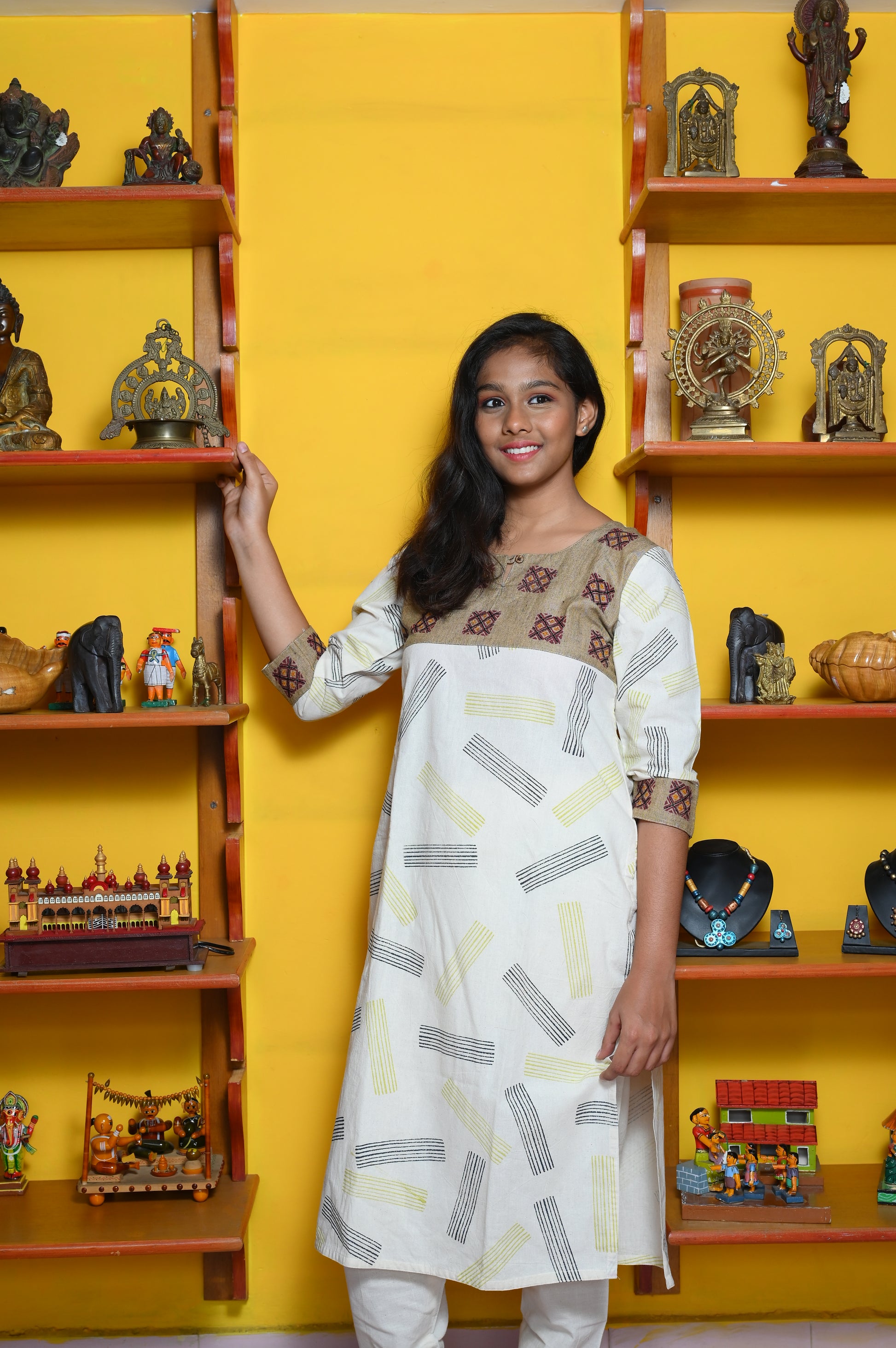 Cream cotton Kurta, with patch work design added to neck line,as yoke.