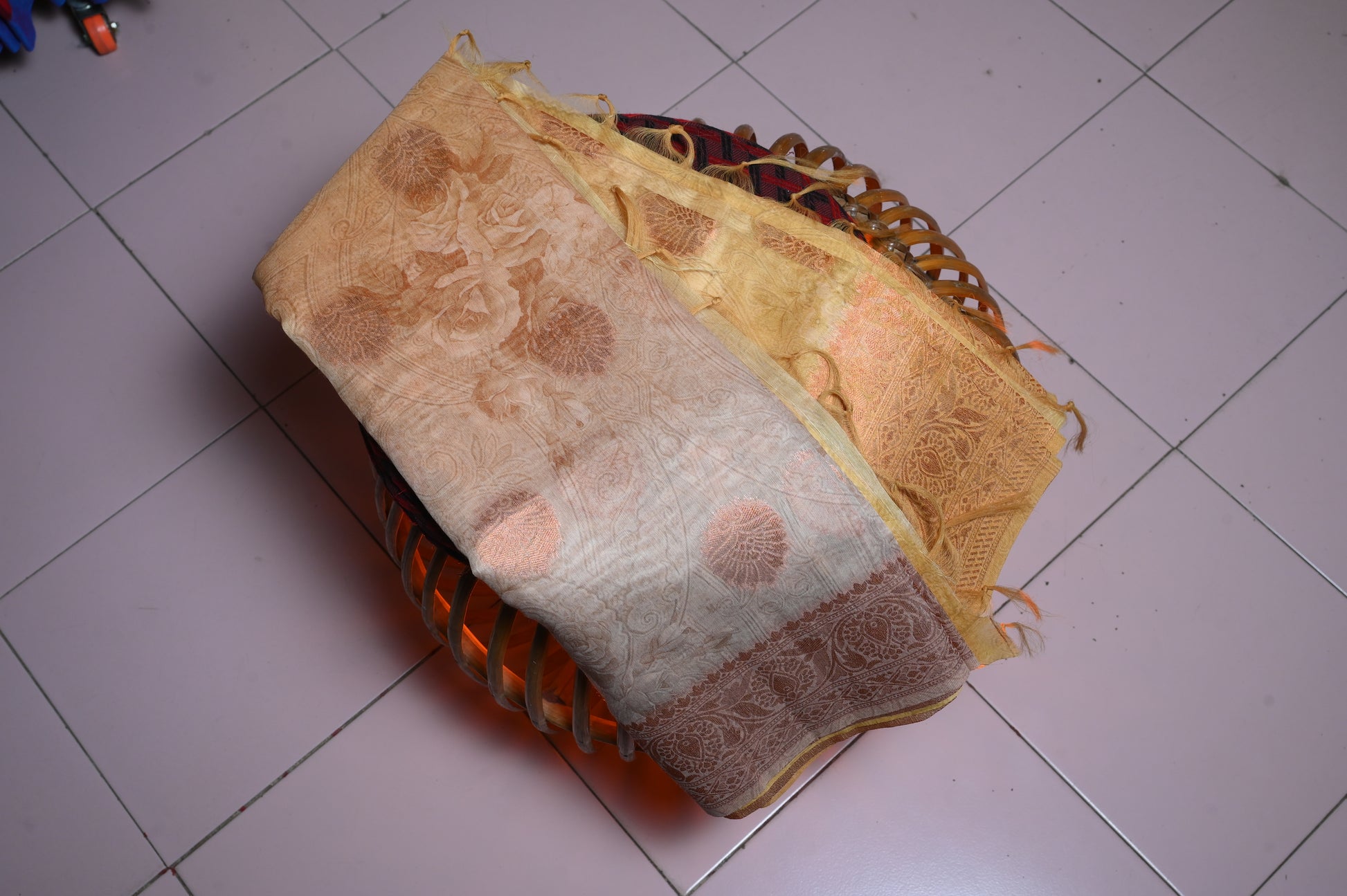 This yellow printed blended cotton sari features a vibrant copper red border, combining traditional aesthetics with comfortable fabric. The breathable blend ensures ease of drape and durability, making it ideal for both casual and festive occasions. Its striking print and elegant border add a refined touch to your wardrobe.